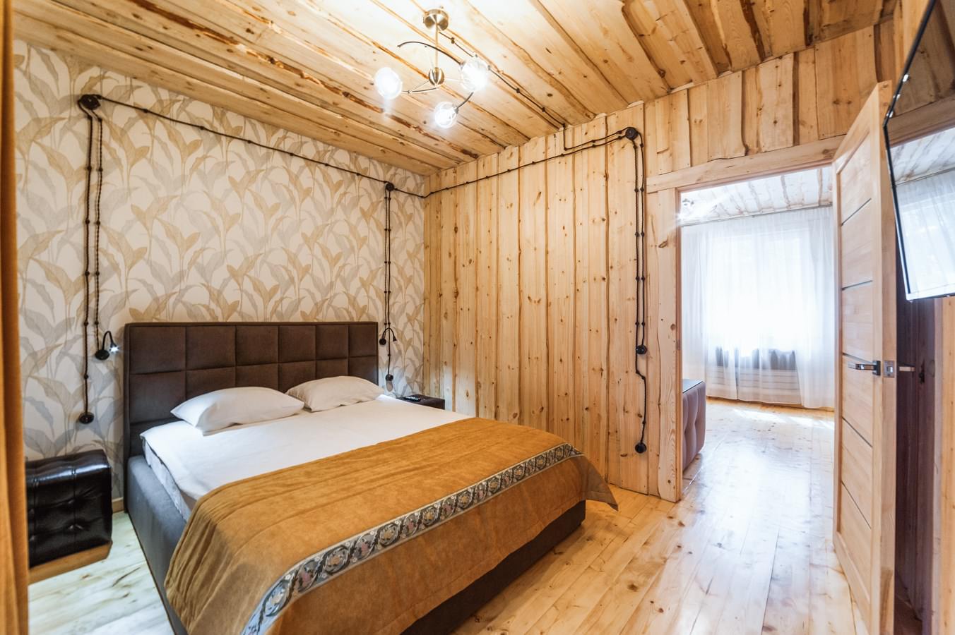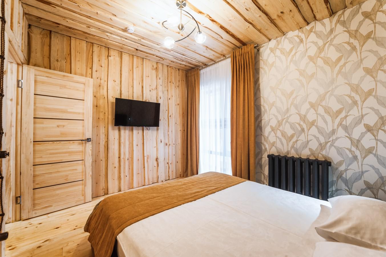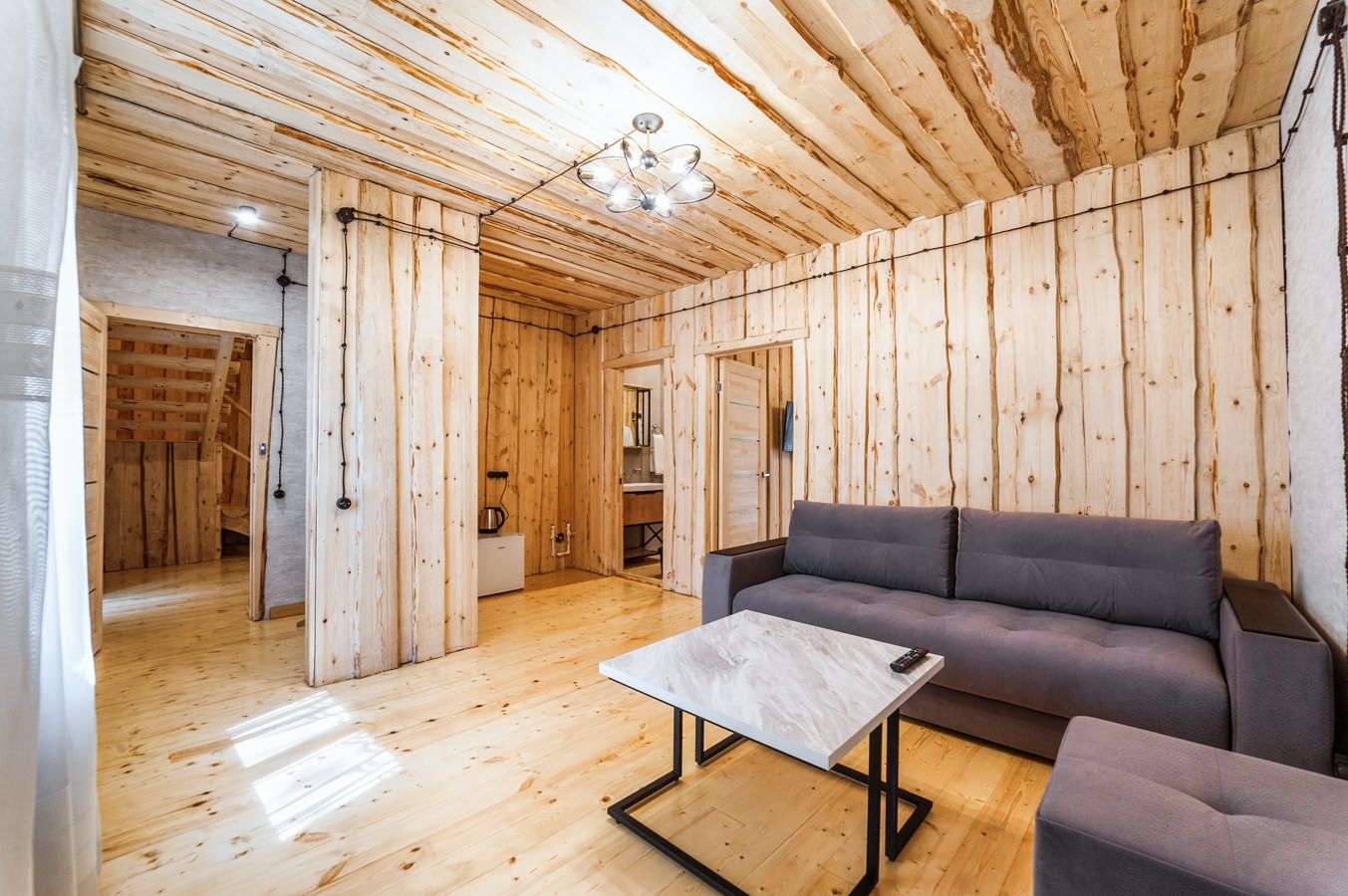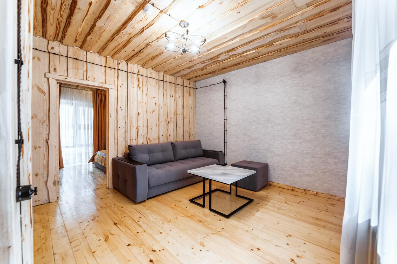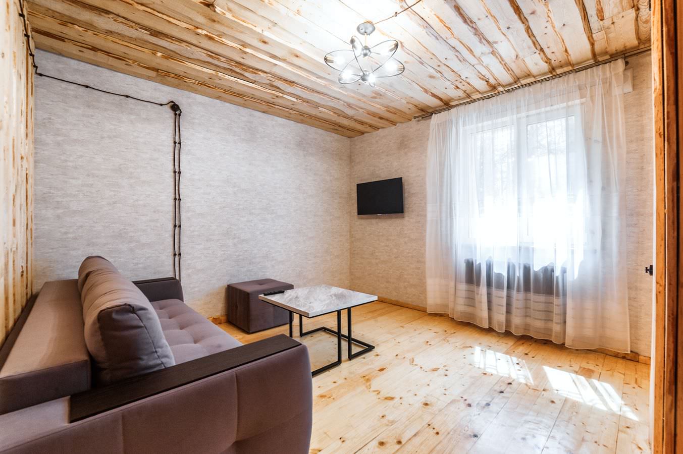 Площадь номера - 35 кв.м. 2 осн. места. 2 доп. места. Кухня. Мебель: диван раскладной, кровать двуспальная, прикроватные тумбочки, столик журнальный, шкаф. Оборудование: мини-холодильник, телевизор, чайный набор посуды, электрочайник. Санузел: с душевой кабиной, тапочки, туалетные принадлежности, фен, халат. Сервис: Wi-Fi бесплатно, смена полотенец, смена постельного белья, уборка номера. Терраса.