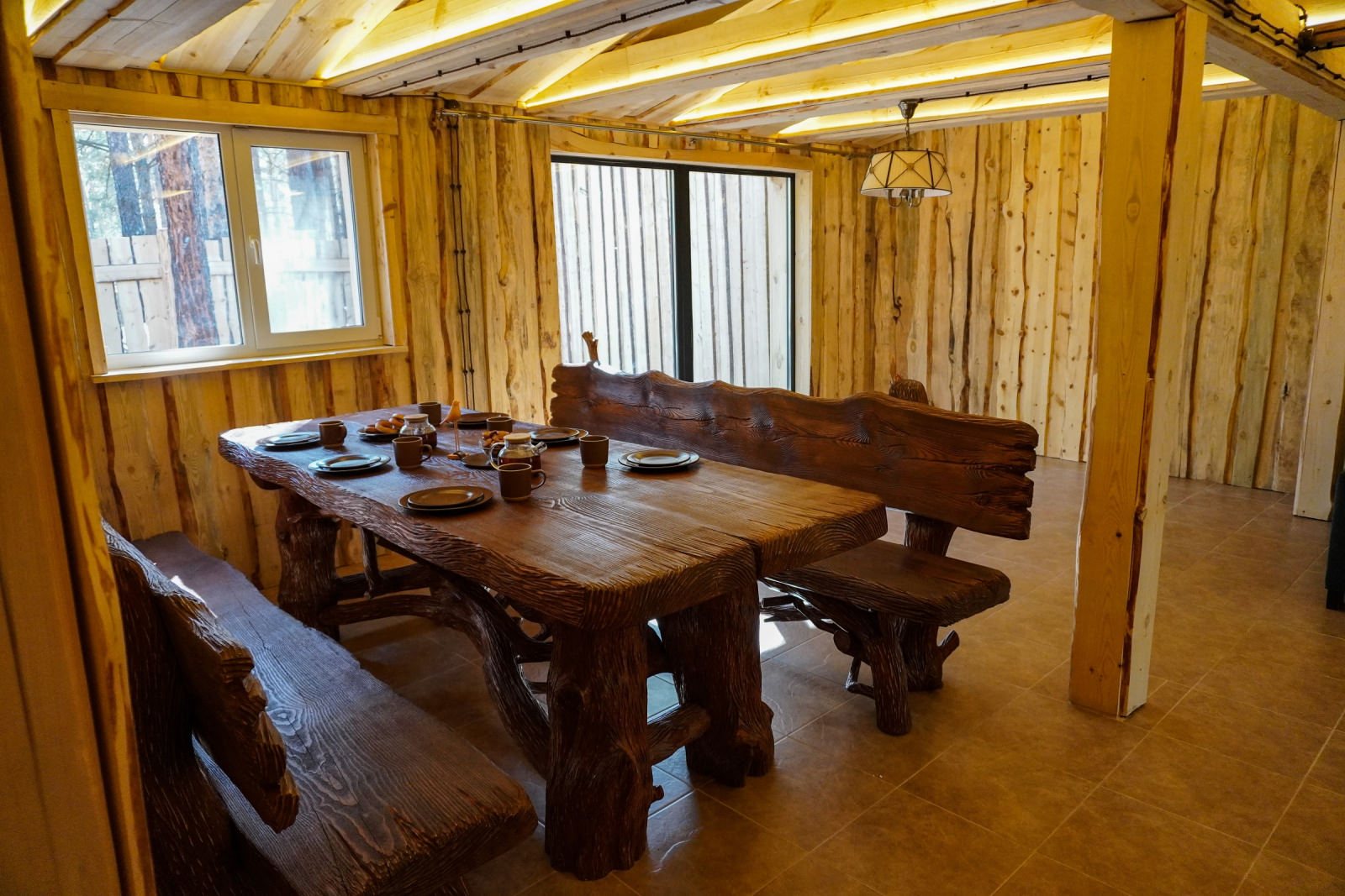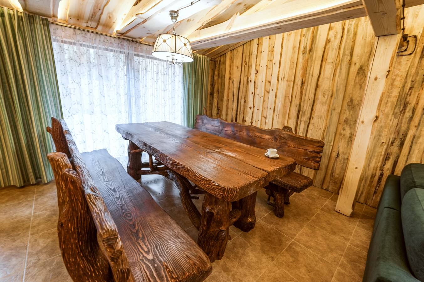 Площадь номера - 189 кв.м. 7 осн. мест. 1 доп. место. Кухня. Мебель: диван раскладной, кровать двуспальная (3 шт.), прикроватные тумбочки, стол, стулья, шкаф. Оборудование: микроволновая печь, набор посуды, плита электрическая, телевизор, холодильник, электрочайник (и кулер). Санузел: 3 санузла, с душевой кабиной, тапочки, туалетные принадлежности, фен, халат. Сервис: Wi-Fi бесплатно, смена полотенец, смена постельного белья, уборка номера. Терраса.