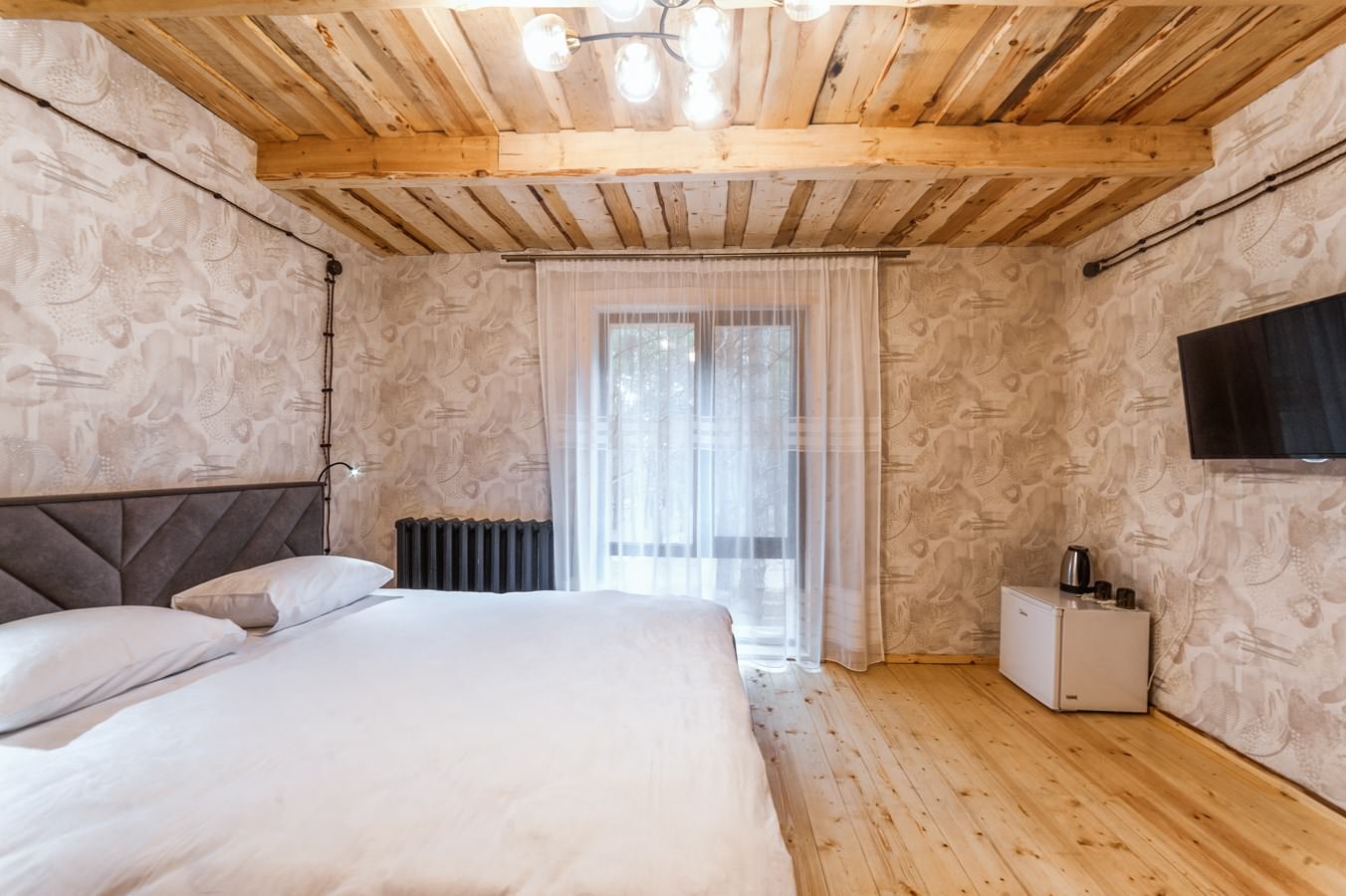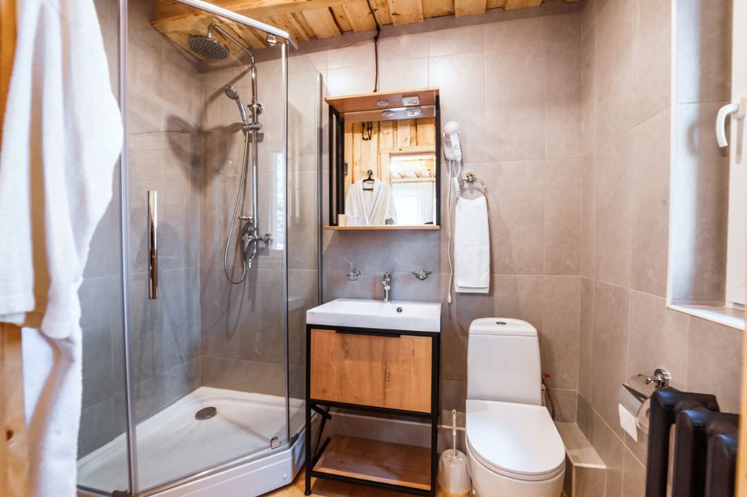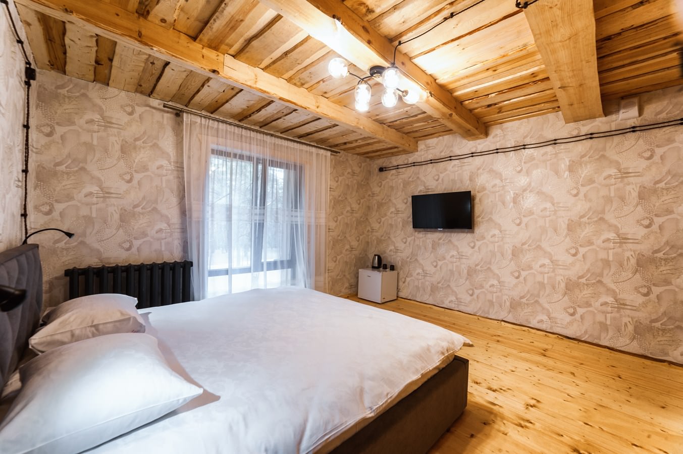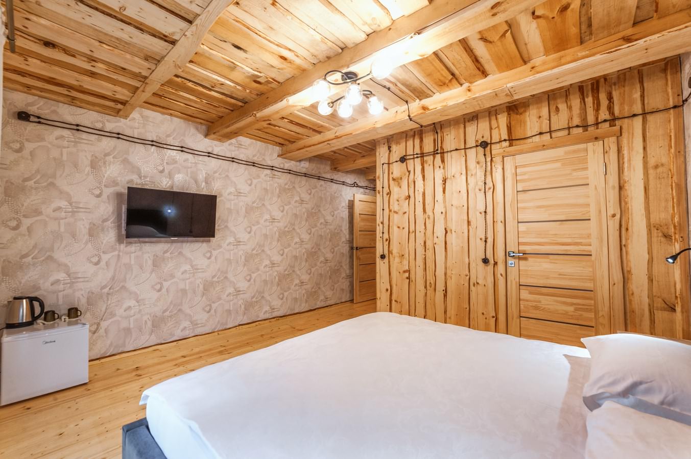 Площадь номера - 22 кв.м. 2 осн. места. Кухня. Мебель: вешалка, кровать двуспальная, прикроватные тумбочки, шкаф. Оборудование: мини-холодильник, телевизор, чайный набор посуды, электрочайник. Санузел: с душевой кабиной, тапочки, туалетные принадлежности, фен, халат. Сервис: Wi-Fi бесплатно, смена полотенец, смена постельного белья, уборка номера. Терраса.